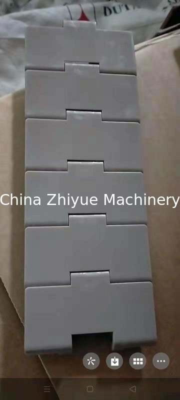 La aplicación principal es para transportar diversos productos alimenticios y contenedores. La 820 es una versión de plástico de la relacionada. Sin embargo, las cadenas de plástico tienen una nervadura central de refuerzo en la parte inferior. El grosor del eslabón es de 4,0 mm (0,16 pulg.) para la serie 820. Los eslabones se superponen, por lo que no hay espacio entre ellos. |
